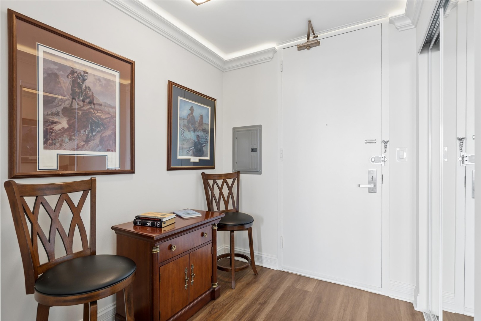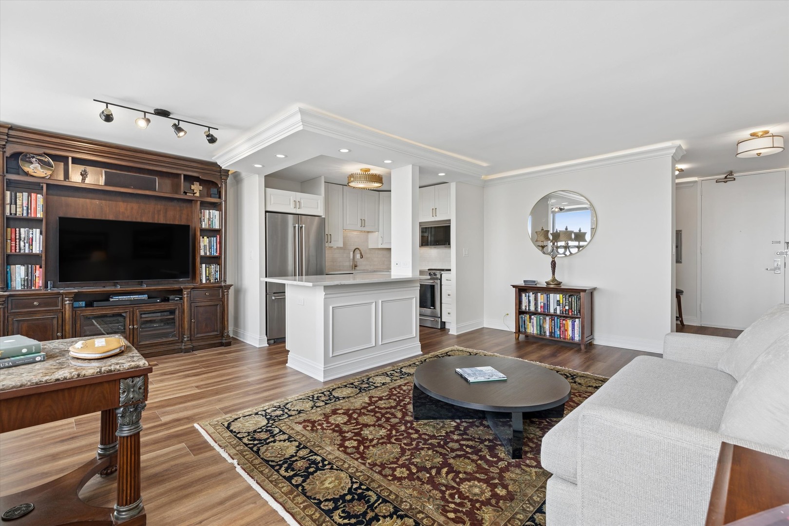 Perched above Hyde Park with sweeping north-facing views of Lake Michigan and the city skyline, this beautifully renovated one-bedroom residence blends timeless design with thoughtful modern updates. Expansive windows frame the ever-changing backdrop of water and city, filling the home with natural light and creating a bright, airy living experience throughout. The interiors have been meticulously reimagined with approximately $55,000 in upgrades, resulting in a cohesive, elevated aesthetic. The kitchen is both functional and refined, featuring custom cabinetry, quartz countertops, a soft-toned backsplash, and a full suite of newer stainless-steel appliances. An oversized island anchors the space, offering both preparation and gathering space while seamlessly connecting to the main living area. Rich flooring flows throughout, complemented by custom crown molding and baseboards-including subtle integrated lighting that adds warmth and dimension. The living and dining areas feel both open and defined, with the dining space perfectly positioned along the windows to capture skyline views throughout the day. The bathroom has been completely transformed into a spa-like retreat, with elegant tilework, updated fixtures, and a glass-enclosed shower. Additional improvements include new doors, updated lighting throughout, and top-down bottom-up blinds in the bedroom for both privacy and flexibility. This home also includes deeded parking and additional storage, offering everyday convenience in a full-service building. Residents enjoy a marble-floored lobby with 24-hour door staff, newly renovated hallways, an updated party room, rooftop sundeck, and a fitness center. Additional amenities include on-site dry cleaning, laundry facilities, bike storage, professional management, and an on-site engineer. Ideally located just moments from the lakefront, the University of Chicago, and downtown access, this is a turnkey home where design, light, and location come together effortlessly.